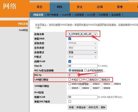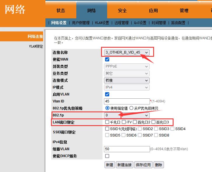 光猫后台——网络——网络设置——网络连接——连接名称——选择iptv的网络连接,确认下vlan编号和802.1p编号。例如我的iptv的vlan编号是45,802.1p编号是0,如下图所示,