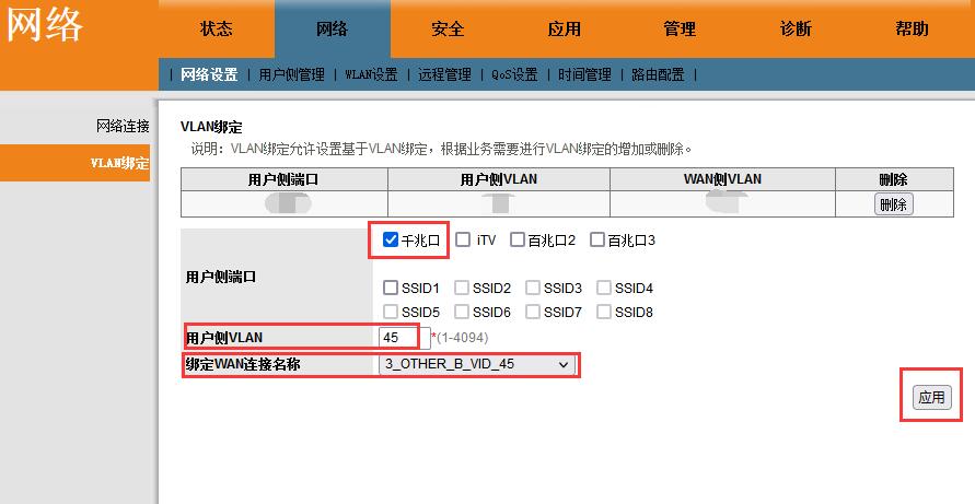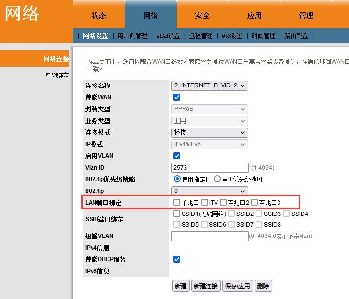 要勾选千兆口,用户侧VLAN填写上一步得到的iptv的vlan编号,绑定WAN连接名称也要选择iptv的。如下图所示,