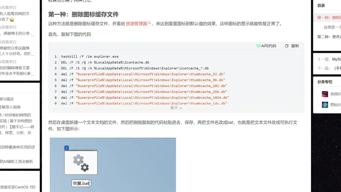在网络上这篇博文中给出了两种方式,第一种方式是删除图标缓存文件。这需要执行博主给出的一个批处理命令文件。第二个是修改 Windows中性能选项,将其中的启动速览选项,以及显示缩略图 选项关闭即可。下面先测试一下第二种方案。